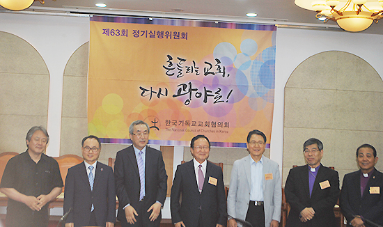 | ▲왼쪽부터 예장통합 측 이홍정 목사, 류영모 목사, 손달익 목사. 그리고 NCCK 주요 실행위원들인 황용대 목사(기장), 전병금 목사(기장), 김근상 주교(성공회), 전용재 목사(기감). ⓒ사진=이인기 기자 |