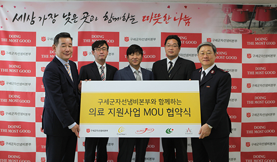 구세군자선냄비본부(이하 본부, 사무총장 이수근)는 8월5일(수) 코클리어코리아, 세인, 아시안스타, 써지텍 임원들이 참석한 가운데 ‘저소득층 장애인을 위한 의료 지원사업’ 업무 협약식을 진행했다. ‘저소득층 장애인을 위한 의료 지원사업’은 비싼 의료비를 감당하기 어려운 저소득층 장애인들을 대상으로 접수를 받아, 심사를 통해 의료비를 지원한다는 내용을 뼈대로 한다.