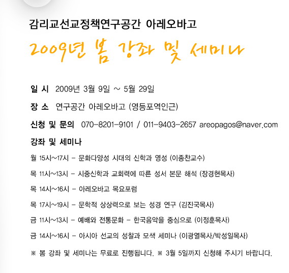 감리교선교정책연구공간 아레오바고 2009년 봄 강좌 안내