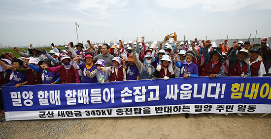 군산과 밀양이 만났다. ‘밀양 765㎸ 송전탑 건설반대대책위원회’(이하 밀양 송전탑 대책위) 주민 20여 명은 8월18일(화) 오후 새만금 송전철탑 건설로 인해 한국전력(한전)과 갈등을 빚고 있는 전북 군산시 산북동 88번 송전철탑 건설 현장을 찾았다.