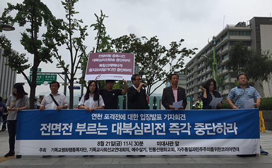 지뢰도발과 포격 등 북한의 도발로 인해 한반도 긴장이 고조되고 있는 가운데 기독교평화행동목자단, 기독교사회선교연대회의, 예수살기, 민통선평화교회, 자주통일과민주주의를위한코리아연대 등 5개 기독시민사회단체는 8월21일(금) 오전 서울 광화문 KT앞에서 긴급 기자회견을 갖고 대북 심리전의 즉각적인 중단을 촉구했다.