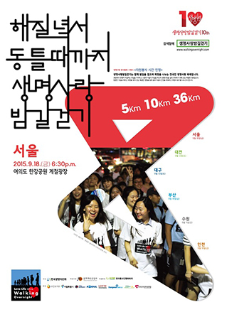 올해로 10회를 맞은 ‘2015 생명사랑 밤길걷기’는 해질녘서 동틀 때까지 걸으며 생명존중문화를 진작하기 위한 취지로 진행한다. 우리나라에서는 하루 39.5명이 스스로 목숨을 끊는다. 이 행사에 현재까지 160,000여 명의 시민들이 참여신청을 했다.