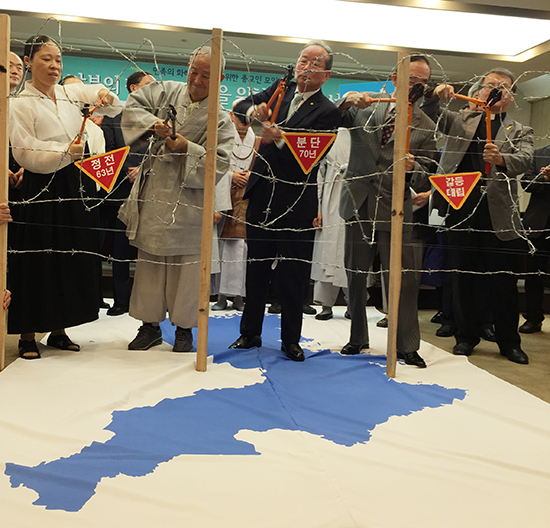 | ▲개신교, 천주교, 불교, 원불교, 천도교 등 5대 종단 종교인들이 휴전선을 끊는 퍼포먼스를 하고 있다. ⓒ사진=지유석 기자 |