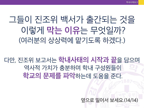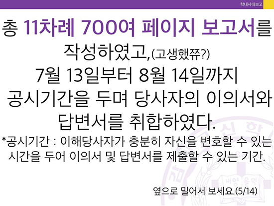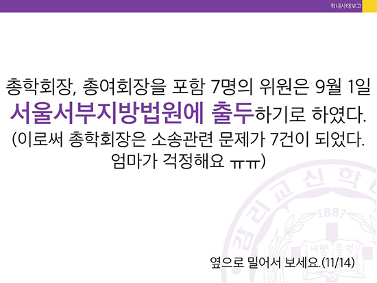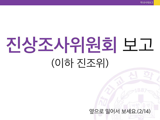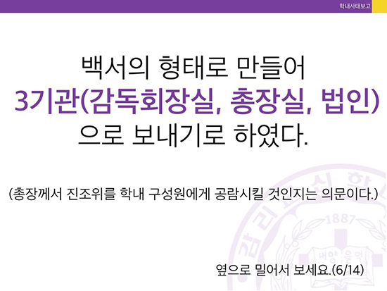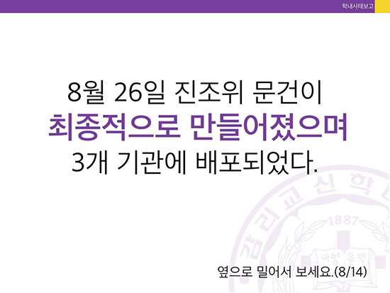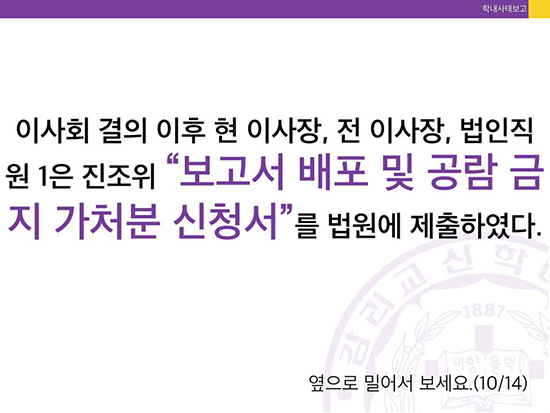 감신대 총학생회는 카드뉴스를 통해 “진상조사위가 11차례에 걸쳐 700쪽 분량의 보고서를 작성했고, 7월13일부터 8월14일까지 공시기간을 둬 당사자의 이의서와 답변서를 취합해 26일 최종본을 완성했”으나 “현 이사장, 전 이사장, 법인직원 등이 보고서 배포 및 공람금지 가처분 신청을 법원에 제출했다”고 알렸다.