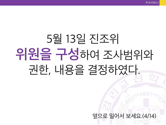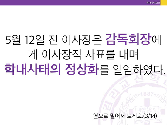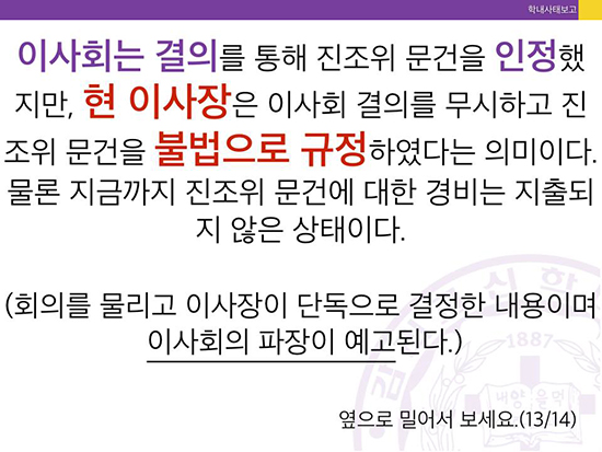 감신대 총학생회는 그러면서 “현 이사장이 이사회의 결의를 무시하고 진상조사위 문건을 불법으로 규정했다”고 규탄했다.