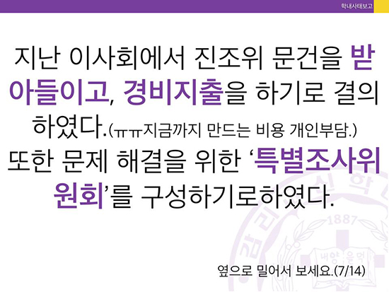 감신대 총학생회는 8월27일(목) 오전 자체 개설한 페이스북 계정에 카드뉴스 형식으로 현황을 알렸다. 카드뉴스는 이미지로 구성하는 뉴스 형식으로 ‘전병욱목사면직청원페이지’도 이런 형식을 통해 자신들의 입장을 전한 바 있다.