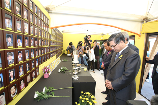 | ▲지난 28일(금) 세월호 참사 발생 500일을 맞은 가운데 한기총 이영훈 대표회장 등 교계 지도자들이 세월호 분향소를 찾아 헌화 후 기도를 하고 있다. ⓒ사진제공= 여의도순복음교회 |