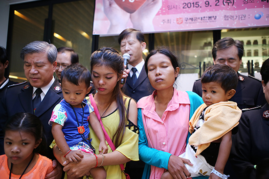 | ▲구세군은 9월2일(수) 오전 서울 종로구 르메이에르 빌딩에서 캄보디아 심장병 어린이 치료 축하 만찬회를 열고 완치를 축하했다. 구세군대한본영 김필수 서기장관(가운데)은 아이들이 건강하게 잘 자라게 해달라고 기도했다. ⓒ사진=지유석 기자 |