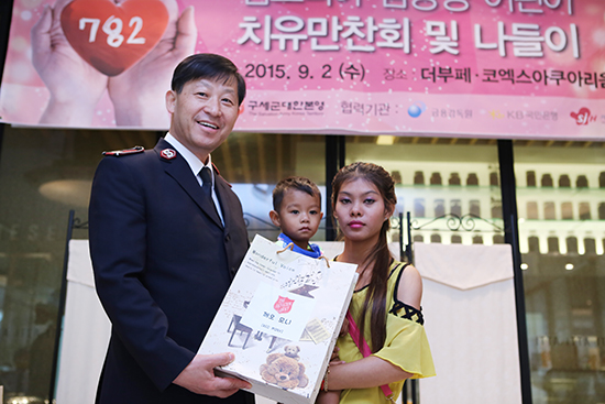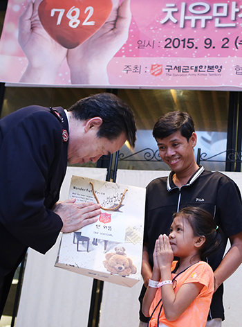 | ▲구세군은 9월2일(수) 오전 서울 종로구 르메이에르 빌딩에서 캄보디아 심장병 어린이 치료 축하 만찬회를 열고 완치를 축하했다. 구세군대한본영 김필수 서기장관(사진 왼쪽)은 수술 아동에게 선물을 건넸다. ⓒ사진=지유석 기자 |