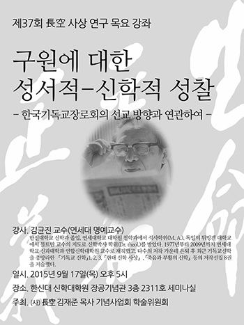 사단법인 장공김재준목사기념사업회(이하 기념사업회, 이사장 김경재 교수)는 오는 9월17일(목) 오후 서울 강북구 인수봉로 한신대학교 신학대학원에서 <제37회 장공사상연구 목요강좌>를 연다. <장공사상연구 목요강좌>는 장공의 사상과 정신, 신앙과 삶을 이어 창조적으로 계승, 발전시키기 위해 열리는 자리다.