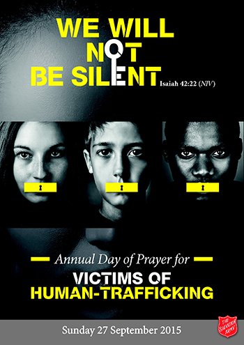 2015년 구세군 인신매매반대의 슬로건은 “우리는 침묵하지 않을 것이다(We will not be silent)”이다. 목소리를 낼 수 없는 피해자들을 대신하여 인신매매의 실태를 알리고 피해자들을 돕겠다는 의지의 표현이다.