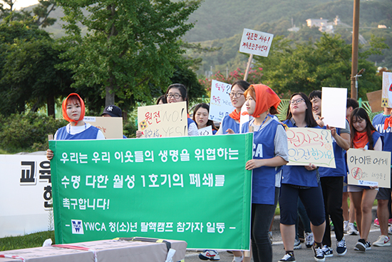한국YWCA연합회(회장 차경애)는 9월3일(목)부터 5일(토)까지 경주와 산청에서 YWCA청소년과 청년을 대상으로 하는 2015년 YWCA 청(소)년 탈핵캠프(YWCA No Nukes Youth Camp)를 열었다. 이번 캠프에는 청소년 Y-틴과 대학청년Y 회원 30여 명이 참석했으며, 탈핵운동 현장인 월성지역을 방문하여 핵발전소의 위험성과 탈핵의 필요성을 확인하고 대안에너지 사용 현장인 산청 민들레학교를 찾아가 탈핵의 가능성도 직접 경험하는 시간을 가졌다.