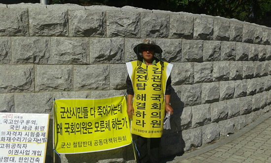 전북 군산 새만금 송전철탑을 둘러싸고 한국전력(한전)과 지역주민 사이의 갈등이 증폭되고 있는 가운데 군산 지역 주민들은 9월8일(화) 오전 서울 여의도 국회의사당 앞에서 송전철탑 문제 해결을 촉구하는 1인 시위를 시작했다. 이날 송전탑 건설지인 군산시 회현면, 옥구읍, 미성동 주민 3명이 상경해 시위를 벌였으며, 이들은 매주 월요일부터 금요일까지 1인 시위를 이어나갈 방침이다.