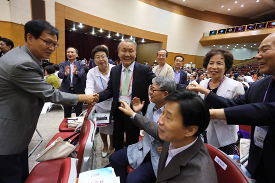 | ▲기장 제100회 총회장으로 선출된 양무리교회 최부옥 목사가 주변 총대들로부터 축하 인사를 받고 있다. |