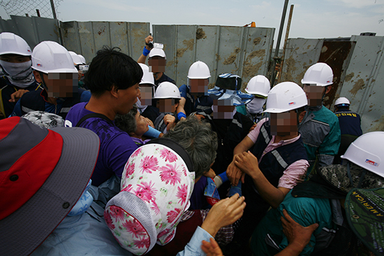 | ▲지난달 18일(화) 전북 군산시 산북동 88번 송전철탑 건설 현장에서 한전 직원과 지역주민들 사이에 충돌이 벌어지고 있는 모습. 송전철탑 건설현장 곳곳에서 이런 광경은 흔히 목격된다. ⓒ사진=지유석 기자 |