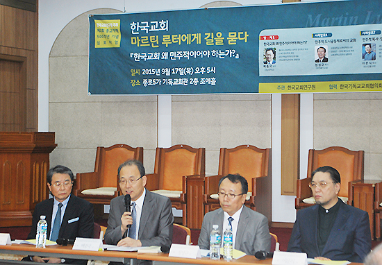한국교회연구원(원장 전병금 목사)은 9월17일(목) 오후5시 한국기독교회관 2층 조에홀에서 ‘제2회 종교개혁 500주년 기념 심포지엄’을 개최했다. 주제는 “한국교회, 마르틴 루터에게 길을 묻다”이며, 백종국 경상대 교수가 “한국교회, 왜 민주적이어야 하는가”를 발제했고, 사례발표로서 정성규 부천예인교회 목사가 “도시공동체로서의 민주적 교회”를, 이문식 광교산울교회 목사가 “목사 장로 민주적 임기제와 그 장단점”을 발제했다.