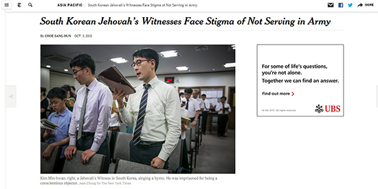 | ▲지난 5월과 8월 법원이 양심적 병역거부자에 대해 무죄를 선고하면서 양심적 병역거부 문제가 다시금 수면으로 떠오르는 가운데 미국 유력 일간지인 뉴욕타임스지가 이 문제에 대해 심층 보도를 내놓았다. ⓒNYT지 홈페이지 화면 갈무리 |