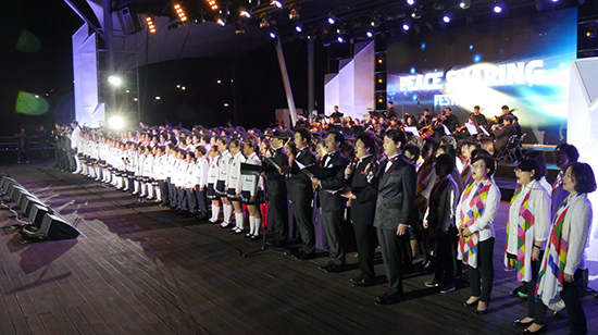 그리고 콘서트 후반부에는 10세부터 100세까지 각 세대를 상징하는 어린이, 청소년, 탈북청년, 해외이주민, 해방동이, 이산가족 등 12명의 참가자가 고은 시인의 “평화의 노래”와 “평화선언”을 낭독했다. 이어 한국YWCA연합합창단, 전국어린이합창단, 시니어합창단, 탈북청년합창단 등의 연합대합창으로 “한반도, 평화에 물들다”의 막을 내렸다.