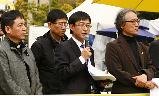 | ▲박찬희 서울신대 교수(가운데)가 지난해 10월 30일 “세월호의 아픔에 참여하는 이 땅의 신학자들”의 긴급 기자회견에서 한국교회에 보내는 호소문을 발표하고 있는 모습. ⓒ사진=지유석 기자 |