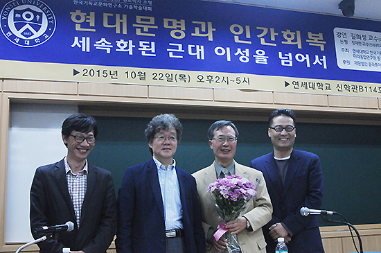 | ▲학술대회 후 대회 주요 관계자들이 기념사진을 촬영하고 있다. 왼쪽부터 박일준 박사(기독교통합학문연구소 소장), 정재현 박사(연세대 신과대 부설 한국기독교문화연구소 소장/연세대 미래융합연구원 종교와사회연구센터 센터장), 길희성 박사(대한민국학술회원), 이관표 박사(연세대/협성대 강사). ⓒ베리타스 |