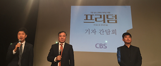 | ▲10월29일(목) 오전 서울 양천구 목동 CBS사옥에서 CBS시네마의 첫 수입작 <프리덤> 기자간담회가 열렸다. [왼쪽부터 고길화 선교TV본부 문화사업부장, 신동원 CBS상무, 임진택 선교TV본부 선교사업국장. ⓒ사진=지유석 기자 |