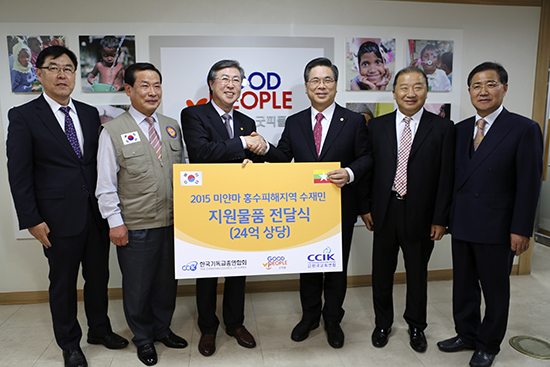 국제구호개발 NGO 굿피플(이사장 이영훈)과 한국교회연합(대표회장 양병희 목사·이하 한교연)은 10월28일(수) 오전 9시 여의도 소재 굿피플 본부에서 홍수 피해를 입은 미얀마 수재민들을 돕기 위한 지원물품 전달식을 가졌다. 전달식은 이영훈 굿피플 이사장과 양병희 한교연 대표회장이 참석한 가운데 진행됐다. 이번 구호 물품 전달은 민족복음화운동본부 총재 이태희 목사의 주선으로 이루어졌다.