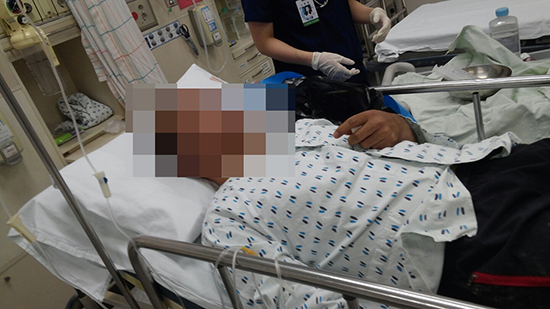 | ▲29일(목) 오후 한전과의 마찰 도중 음독자살을 시도한 김 모 씨(50세)가 군산의료원으로 이송돼 응급처치를 받았다.[사진제공 = 새만금송전철탑반대 공동대책위원회] |