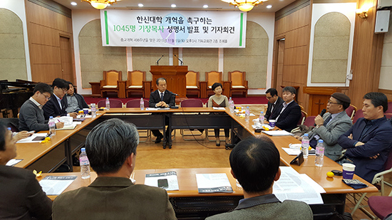 채수일 한신대학교 총장이 경동교회 담임목사로 자리를 옮길 예정인 가운데 한신대학교의 개혁을 촉구하는 기장 목회자들이 11월5일(목) 오후 기독교회관 조에홀에서 성명을 발표했다. 이 성명서에는 1045명의 기장 목회자들이 서명했다.