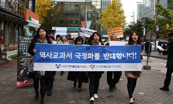 | ▲한국YWCA와 한국YMCA전국연맹 등 두 단체 회원들이 지난 9일 "역사교과서 국정화를 반대한다"며 공동기자회견 후 현수막과 피켓을 들고 행진을 벌였다. ⓒ사진제공= 한국YWCA |