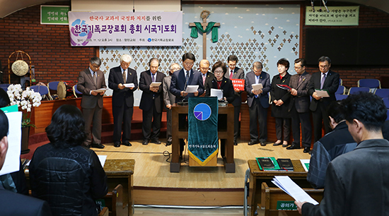 시국기도회는 설교에 이은 성명서 낭독 순서로 이어졌다. 기장은 시국기도회 참가자 일동 명의의 성명에서 “박근혜 정부가 추진하려는 ‘국정교과서’는 ‘일제강점기를 경제발전기’라고 해석하는, 소위 뉴라이트 계열의 역사관을 ‘올바른’ 것이라 선언하면서 전체주의적으로 획일화시키려 한다”며 정부를 향해 “다양한 역사 해석의 가능성들을 ‘그릇된 것’으로 규정하는 그 같은 오만함은 어디에서 비롯된 것인가?”라고 물었다. 그러면서 “아버지 박정희의 역사를 미화하려는 이 경악스러운 독재적 발상을 우리는 결코 용납할 수 없으며 ‘한국사 교과서 국정화’의 저지가 독재에 맞서 민주주의를 수호하는 것”임을 선언했다. 또 국정화 고시 이후 ‘소모적인 논란을 없애는 긍정적 조치’라고 한 정부여당에 대해선 “‘국정교과서 반대자들의 불필요한 논란 때문에 민생을 돌볼 수 없다’거나 ‘경제가 어려운 것은 저 반대자들 탓’이라는 치졸한 공략”이라고 비판했다.