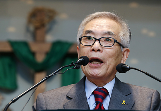 | ▲12일(목) 오후 서울 중구 명동 향린교회에서 ‘한국사 교과서 국정화 저지를 위한 시국기도회’가 열린 가운데 김상근 목사가 설교하고 있다. ⓒ사진=지유석 기자 |