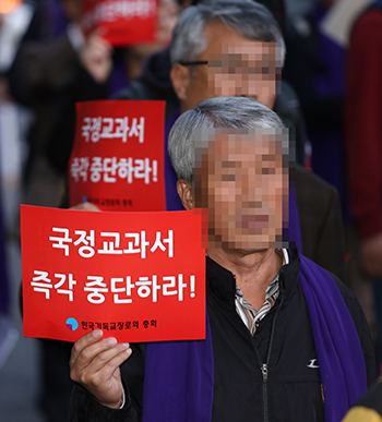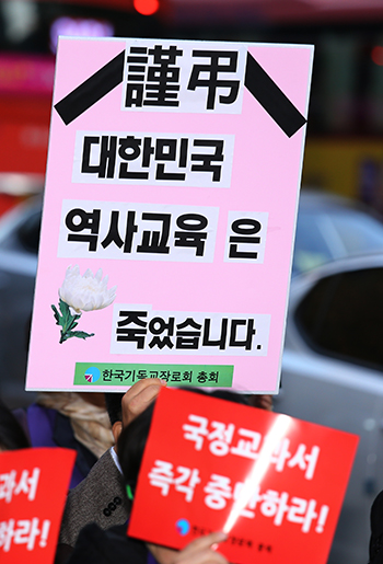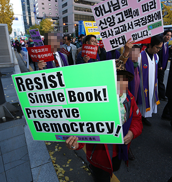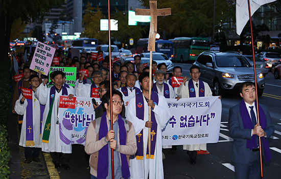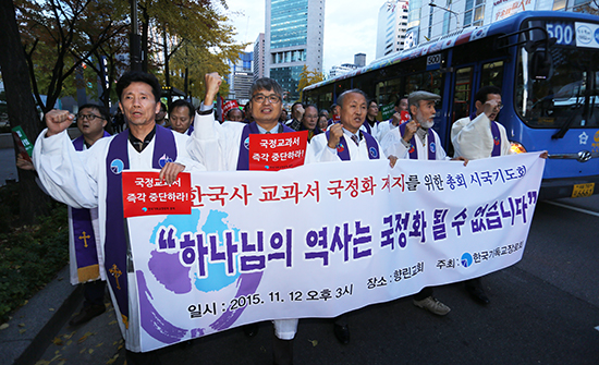 한국기독교장로회(기장, 총회장 최부옥 목사)가 11월12일(목) 오후 서울 중구 명동 향린교회(담임목사 조헌정)에서 ‘한국사 교과서 국정화 저지를 위한 시국기도회’를 가진 가운데, 기도회를 마친 목회자 및 신도들이 평화 순례에 나섰다.