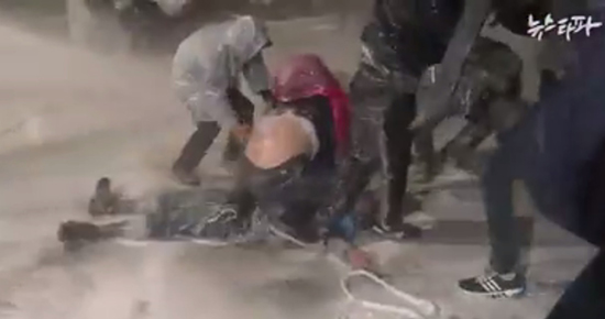 | ▲11월14일(토) ‘민중총궐기’ 대회 이후 참가자들과 경찰이 곳곳에서 충돌한 가운데 전남 보성군 농민회 소속 백남기 씨가 경찰의 물대포를 맞고 쓰러지는 사고가 발생했다. 경찰은 쓰러진 백 씨와 그를 부축하려는 시민들을 향해 계속해서 물대포를 발사했다. ⓒ사진출처= 뉴스타파 화면 갈무리 |