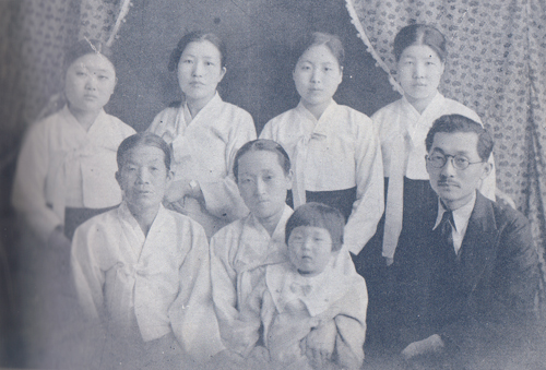 | 1932년, 미국에서 박사학위를 받아 귀국한 송창근 목사(앞줄 맨 오른족)가 첫 담임목사를 맡은 평양 산정현교회의 신도들과 함께 사진을 찍었다. 부인 김재권 사모(앞줄 가운데)가 막내딸 시온 양을 안고 있다. 사진제공=경건과신학연구소 |
