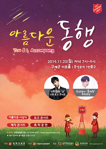 구세군자선냄비본부(사무총장 이수근)는 11월 23일(월) 오후 7시 충정로에 위치한 구세군 아트홀에서 자원봉사자들을 위한 문화 나눔 축제, [아름다운 동행]을 개최한다.