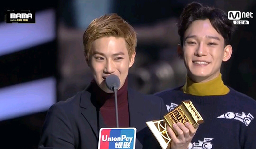 | ▲'2015 마마' 앨범상을 수상한 그룹 엑소가 수상 소감을 전하고 있다. ⓒM net 방송화면 캡쳐 |