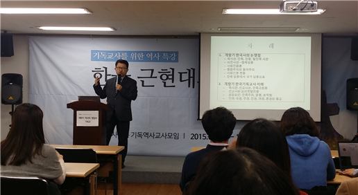 | ▲옥성득 교수가 기독교사를 위한 역사 특강을 진행하고 있다. 옥 교수는 이날 강연에서 "개화기 조선사회에 다양한 역사관이 존재했다”며 국정교과서가 반역사적인 것임을 드러내 주목을 모았다. ⓒ사진=신경택 객원기자 |