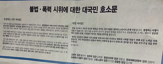| ▲12월5일(토) 제2차 민중총궐기가 예정된 가운데, 교육부, 법무부, 행정자치부(행자부), 문화체육관광부(문체부), 농림축산부(농림부), 고용노동부, 경찰청 등 7개 부처는 공동으로 4일(금) <조선일보>, <동아일보> 등 주요 일간지에 <불법, 폭력 시위에 대한 대국민 호소문>(이하 호소문)을 내고 불법-폭력 시위를 자제해줄 것을 촉구했다. ⓒ베리타스 DB |