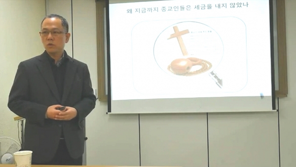| ▲김선택 한국납세자연맹 회장이 "종교인 과세 무엇이 문제인가"라는 주제로 발표하고 있다. ⓒ사진출처= 유튜브 동영상 캡쳐 |