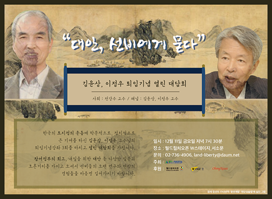 토지정의운동에 심혈을 기울여 온 김윤상(66) 경북대 행정학부 석좌교수와 이정우(65) 경북대 경제통상학부 명예교수의 열린대담회가 개최된다. 김 교수는 지난 2월에 정년퇴임을 했고 이 교수는 지난 8월에 퇴임했다.
