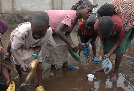 | ▲콩고 키바티 난민 캠프에서 어린이들이 오염된 마을 웅덩이에서 진흙이 뒤섞인 물로 세수를 하고 세탁을 하고 있다. 이 물은 하수처리가 되지 않은 채 식수원으로 흘러 들어가게 되고 어린이들은 다시 이 물을 마셔 각종 질병에 시달리게 된다. ⓒ유니세프 |