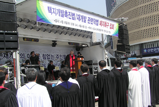 신도시·재개발 지역 전국교회연합회(이하 전국교회연합회) 주최로 8일 오후 2시부터 시작된 택지개발촉진법 및 재개발관련 악법폐지 촉구집회에 연설자로 나선 서경석 목사(기독교사회책임공동대표)는 ▲ 택지개발촉진법 및 재개발관련 법이 악법이라고 했고 ▲ 진보·보수를 막론하고 이 악법 폐지를 위해 뭉쳐야 할 때라고 했으며 ▲ 예수님은 약한 자들, 즉 세입자들의 편이라고 강조했다.