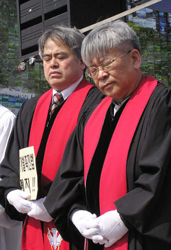 | ▲ 연설을 마치고 강단에서 내려온 서경석 목사(우)가 상가임대교회 목회자들과 함께 택지개발촉진법 폐지를 놓고 기도하고 있다 ⓒ김진한 기자 |