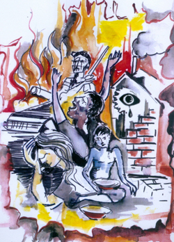 | ▲ 2009 아시아 주일예배 표지그림. 상처로 얼룩진 스리랑카의 현장 그리고 그 눈물을 형상화 했다. |