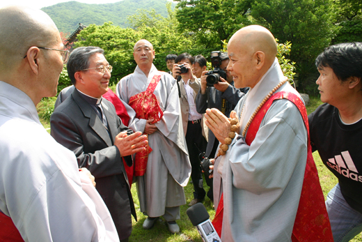 | ▲ 지난 2008년 5월 전남 순천 조계산 태고총림 선암사를 방문한 주교회의 교회일치와 종교간대화위원회 위원장 김희중 주교를 태고종 종정 혜초 스님이 반갑게 맞이하고 있다 ⓒ한국 천주교 주교회의 |