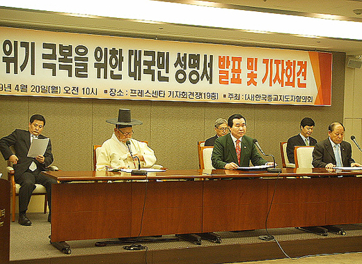 나라의 경제 위기 극복을 위해 종교인들이 팔을 걷어 부쳤다. (사)한국종교지도자협의회(공동대표의장 엄신형 목사, 이하 종지협)가 20일 프레스센터 19층 기자회견장에서 ‘경제위기 극복을 위한 대국민 성명서 발표 및 기자회견’을 가진 것.
