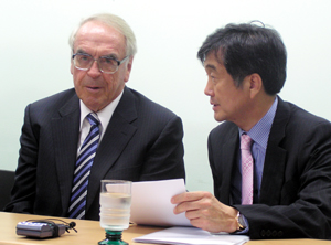 | ▲위르겐 몰트만 박사(좌)가 기자들의 질문에 대답하고 있다. 한신대 채수일 교수(우)가 통역을 도왔다. |