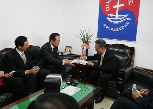 새로 선출된 한나라당 정몽준 대표가 한국기독교교회협의회(NCCK)를 내방했다. 정 대표를 맞이한 NCCK 권오성 총무는 “한나라당 대표최고위원이 된 것을 축하한다”며 “어려운 이웃을 돌보고 봉사하는 것이 정치인의 의무이기에 사회 약자를 돌보는데 노력해 달라”고 요청했다.