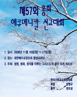 한국기독교교회협의회(NCCK) 제 57회 총회 에큐메니칼 선교대회가 11월 16일부터 17일까지 명성교회당에서 ‘생명,평화,정의를 이루는 그리스도의 몸이 되게 하소서’라는 주제로 열린다.
