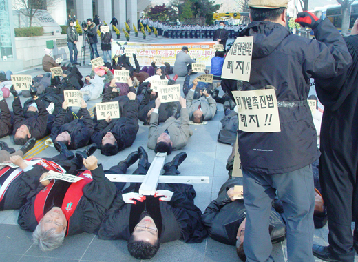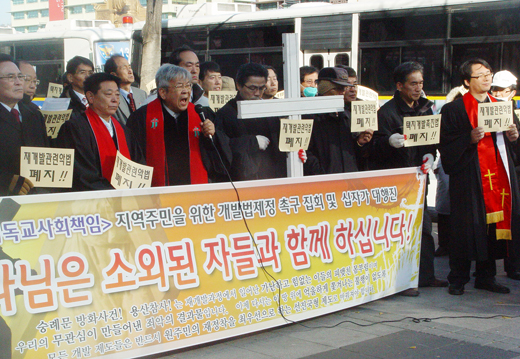 목회자들과 일부 성도들이 쌀쌀한 추위에도 불구하고, 광화문 광장 일대 차가운 바닥에 드러누웠다. 개발중단 및 지역주민을 위한 개발법 제정을 연일 촉구해 온 이들은 17일 오후 광화문 광장 일대에서 거리 시위를 전개하려 했으나 경찰의 제지로 뜻을 이루지 못하자 차가운 바닥에 줄지어 드러눕는 시위를 택했다. 기독교사회책임이 주관한 이날 시위에는 가운을 입은 목회자들과 성도들 50여 명이 참여했다.